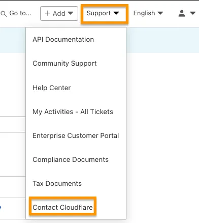 2. In the upper right corner of the Cloudflare dashboard, select Support > Contact Cloudflare.